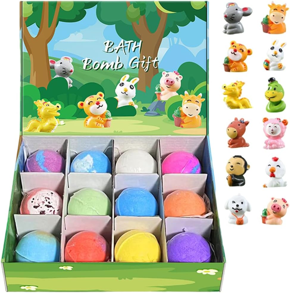 Description: 12Pcs/Set Bath Bombs with Toys Inside 2 Inch Bath Bombs with Cute Animal Toys, Child-Safe Fizzy Colorful Bubble Bathroom Supplies for Kids are perfect for making bath time magical and fun; each colorful bath bomb dissolves quickly in warm water creating vibrant fizzy bubbles while revealing a surprise child-safe animal toy inside that sparks joy and curiosity; crafted with gentle, ingredients ideal for kids' sensitive skin, these bath bombs ensure safe and soothing baths; the set of 12 a wonderful option for birthdays, holidays, or any special occasion, providing endless entertainment, while the easy-to-clean formula leaves no messy residue, making bath time enjoyable and hassle-free for both kids and parents. Features:. Bath Bombs with Toys Inside. -Color: Blue. -Material: Sea Salt. -Size: Each Ball about 5.3cm/2.09inch. Note:Manual measurement, please allow slight errors on size.The colors may exist slight difference due to different screens. Package Including 12Pcs/Set Bath Bombs with Toys Inside