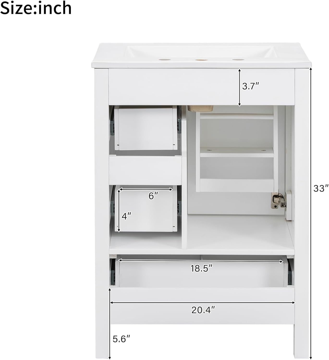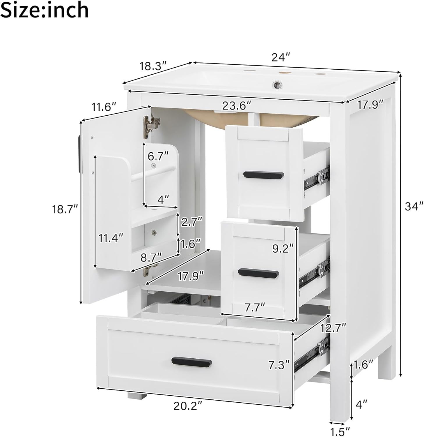 Description24-Inch Modern Bathroom VanityThis 24-inch modern bathroom vanity combines style and functionality, thoughtfully designed for compact bathrooms and powder rooms. Featuring a well-organized storage layout with one door and three drawers (including a divided drawer), along with spacious storage beneath the sink, it easily accommodates daily essentials and toiletries. The integrated ceramic sink includes three pre-drilled faucet holes and an overflow hole, making everyday cleaning effortless. Crafted with a solid wood frame and MDF door panels, this vanity offers both durability and elegance, seamlessly blending bathroom aesthetics with practical performance.Weights & DimensionsProduct Size: 24"W*18.3"D*34"H, 77.16 lbsSink: 24"W*18.3"D*7.1"H, 26.46 lbsVanity: 23.6"W*17.9"D*33"H, 50.71 lbsWeight Capacity: Overall: 99.21 LBSSpecificationsProduct Name: Bathroom VanityOrigin: VietnamStyle: TransitionalMounting Type: Free-standingCabinet Color: White/GreySink Material: CeramicCabinet Material: Solid wood + MDFHandle Material: Zinc AlloyFinish Type: Painted FinishSink Type: Undermount/Drop inSink Shape: RectangularFaucet Mount: 8" Centerset (not included)Overflow Hole included: YesVanity Top Edge Type: FlatEdge Thickness: 0.8"Number of Doors: 1Number of Drawers: 3Soft Close Door Hinges: YesAssembly: Assembly RequiredNumber of packages: 1