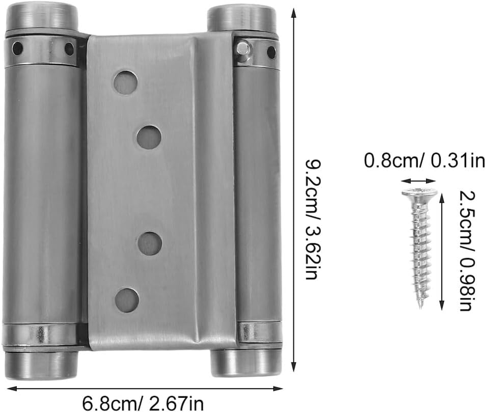 Package List 4 x Hinge 32 x screw 1 x wrench Features -Material:Stainless steel -strength for heavy doors: these hinges heavy duty securely support substantial door weights, ensuring stability in daily operations at homes or businesses door hinge installation kit -Size:9.20X6.80X2.20cm/3.62X2.67X0.86in -Size:2.50X0.80X0.80cm/0.98X0.31X0.31in -Rustproof stainless steel durability: these door hinges resist rust and deformation, providing lasting value for garage doors, entry doors, or double opening spring hinge setups self closing hinges for doors -Color:Silver -Flexible & simple installation: our door hinge self closing kit allows mounting as door hardware or door hinge replacement for garage, cafe, or swing doors self closing hinges -Automatic selfclosing feature: these self closing spring hinges keep doors closed without manual intervention, perfect for busy public or residential areas stainless steel door spring hinge -Product Info: Automatic door hingeGoods Informationautomatically closing door hinge The hinges stainless steel provide exceptional durability and silent operation, minimizing noise even in busy locations.heavy duty hinges for wood doors Transform your space with these double spring stainless steel door hinges, providing self closing functionality for café, wood, or swing doors.door closer hinge self closing Easily installed, each spring hinge delivers stable automatic closure, convenience, and a stylish hardware solution for their doors