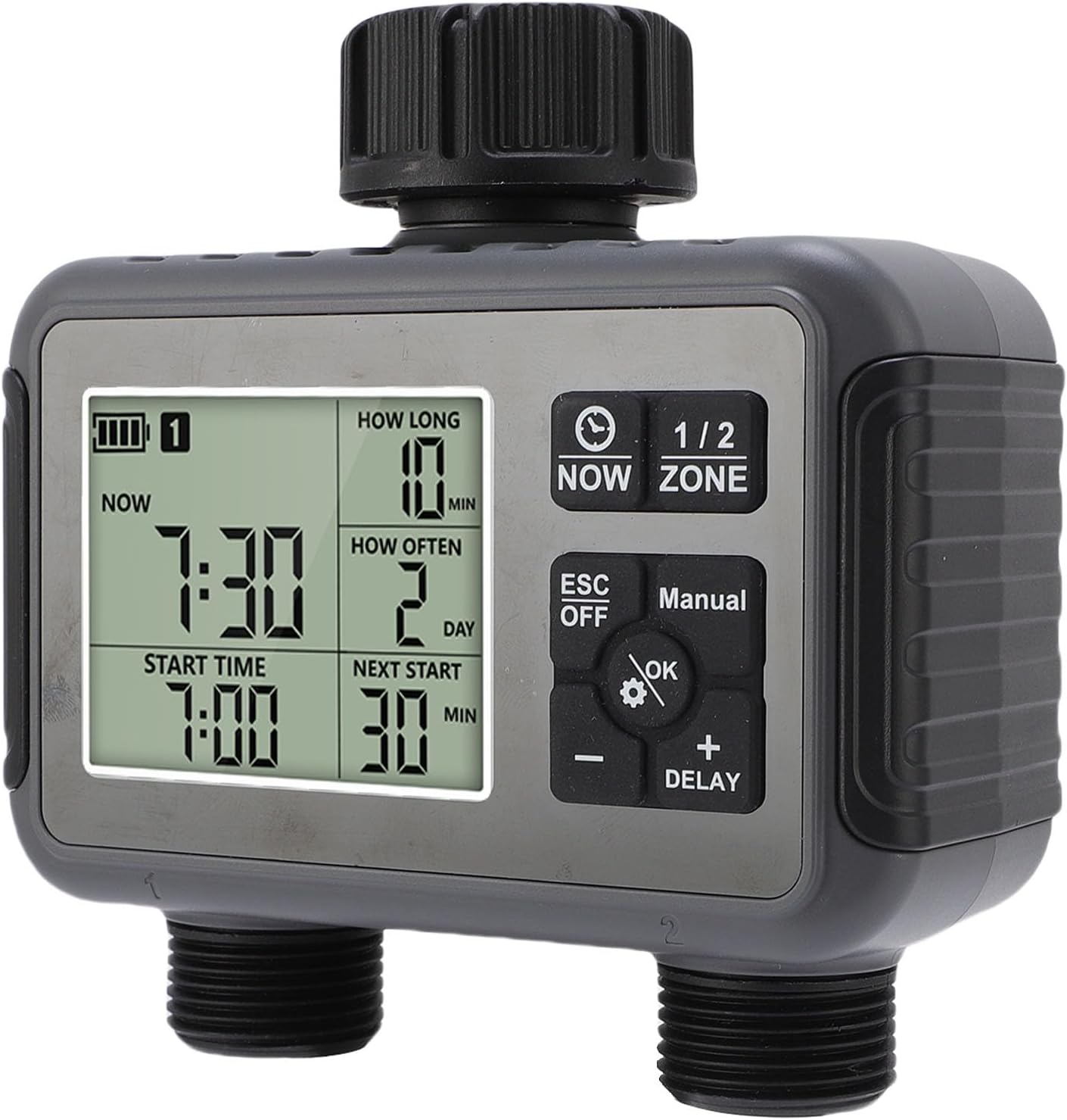 [INTUITIVE LCD DISPLAY] The irrigation timer boasts a bright and clear LCD screen that ensures effortless programming of watering schedules. Its high visibility under direct sunlight allows for easy monitoring and adjustment making it a user friendly choice for all gardening enthusiasts.[SMART TIMING FUNCTION] Customize your watering schedule with precision using the intelligent timing feature. Set specific times and frequencies tailored to your plants needs ensuring optimal hydration without the risk of over or under watering for healthier greener gardens.[VERSATILE COMPATIBILITY] Designed to fit 3/4 to 1/2 inch faucets this irrigation timer offers broad compatibility with most household setups. Its universal design simplifies installation and use across various outdoor environments eliminating any hassle in selection.[AUTOMATIC WATERING CONVENIENCE] Enjoy the luxury of automated watering for your outdoor spaces. With preset timers you can confidently leave home knowing your plants will receive the right amount of water at the right time enhancing both efficiency and peace of mind.[EASY TO USE DESIGN] Perfect for users of all ages this water timer features straightforward operation with clear instructions. No complicated setups are needed making garden maintenance a simple and enjoyable task for everyone.Spec:Item Type: Watering TimerProduct Material: ABSPower Source: 2 x AA Battery (not included)Water Proof Level: IPX5Watering Frequency: 1-23 hours or every 1-15 daysWorking Water Pressure: 7.25-116 PSIFeatures: Lawn watering, potted plant drip irrigation, pool water storage, mist cooling, temporary watering, customizable watering duration, single time point watering, timed watering for specific time periodWeight: Approx. 490g / 17.3ozPackage List:1 x Main Unit1 x User Manual5 x AccessoriesNote:
