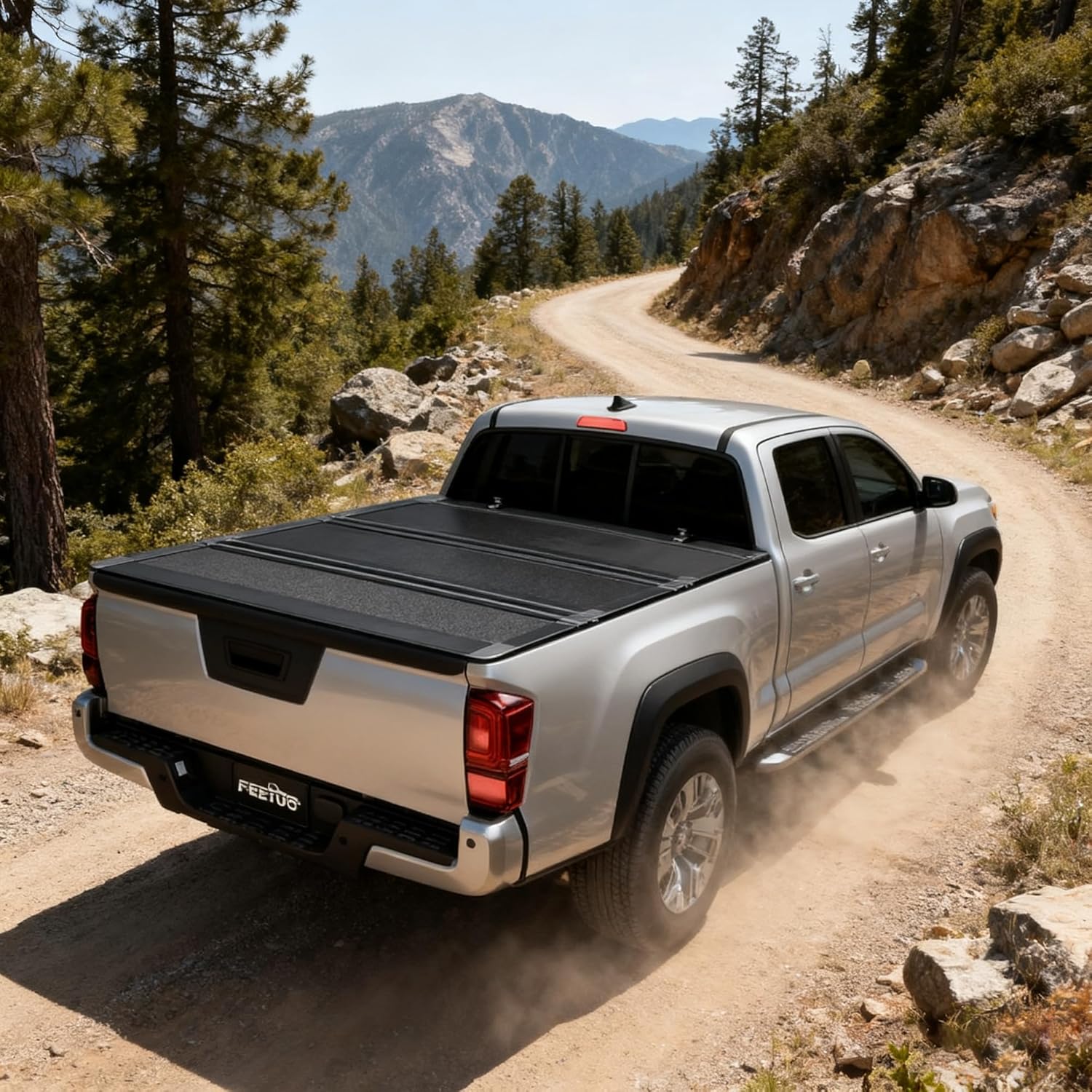 integrated buckle system and automatic latching mechanism allows you to drive with the cover partially or fully opened. For 100% bed access, simply unlock the cover from either side via its pull latches and fold the cover all the way up against the cab. From there, you can prop the cover in place by tightening two rods into the underside of the panel.