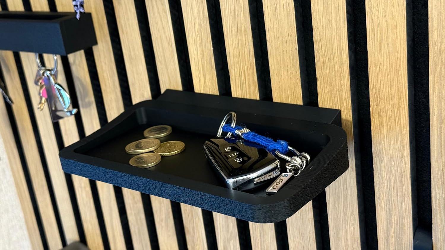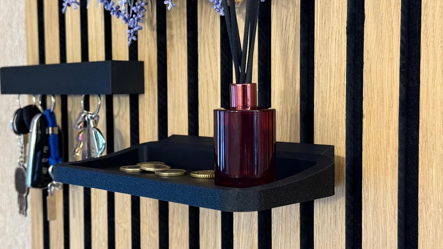 Keep your essentials organized in style with this sleek Floating Shelf, designed specifically for acoustic panels. Featuring a no-drill installation using QuickFix brackets, this shelf offers clean functionality with a minimalist, floating design that blends perfectly into any modern interior. Display your diffuser, wallet, perfume, or small décor items while maintaining a neat and contemporary look. 💡 Perfect for: Living room, office, hallway, or workspace – anywhere you want elegant organization without drilling or damaging your wall! 📏 Specifications: Color: Matte Black Material: Durable, high-quality polymer Installation: QuickFix Brackets (No drilling required) Weight Capacity: Up to 4 kg 🔗 Compatible with Acoustic Panels: Vertical or horizontal slat direction Panels with nailed or glued slats Slat width: 12–15 mm Slat depth: 9–15 mm 📐 Dimensions: Shelf Width: 210 mm Shelf Depth: 115 mm Inner Tray: 188 × 78 mm 🛠️ What’s in the Box: ✔ 1× Floating Shelf ✔ 1× QuickFix – DSDesign Bracket (No rotation, no wings) ✔ 1× Installation tool ✔ 1× Illustrated instruction manual 🔹 Why Choose Our Floating Shelf: ✔ No-Drill Installation – Mounts directly to acoustic panels, no damage ✔ Floating Design – Seamless, modern appearance with hidden mount ✔ Strong & Secure – Holds up to 4 kg safely ✔ Matte Black Finish – Timeless look for any décor ✔ QuickFix Bracket Included – Simple, reliable click-in system 📦 Trackable Shipping: Every order is carefully packed and shipped with tracking for peace of mind. 🌱 Eco-Friendly Manufacturing: Produced using 100 % renewable solar energy — sustainable and precise. ⚖️ Legal & Copyright: All designs are original creations by DSDesign and protected under copyright law. Any reproduction or distribution is strictly prohibited. 🚫 Returns & Exchanges: Due to the made-to-order nature of this item, returns are not accepted. However, if you experience any issue, please contact us — we’ll be happy to assist. 🚫 Note: Decorative items shown in photos are for display only and not included.