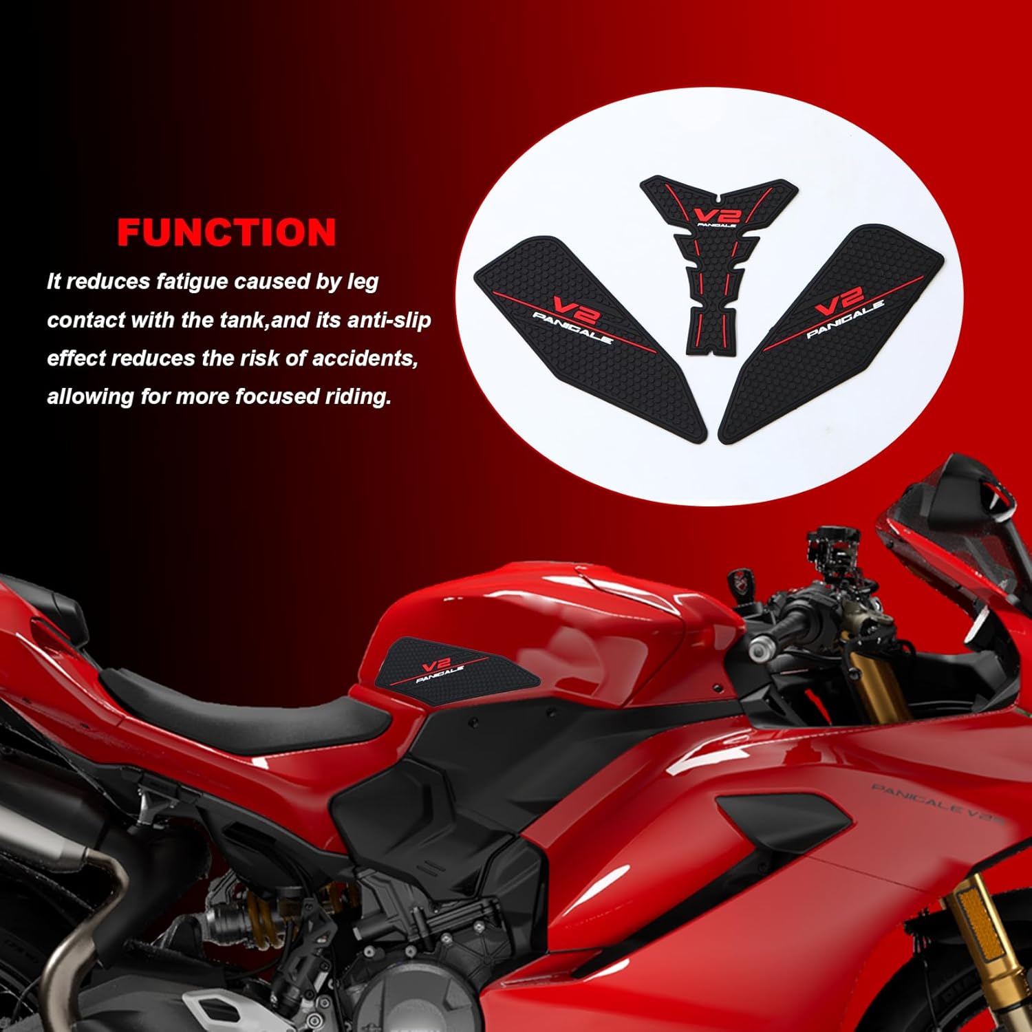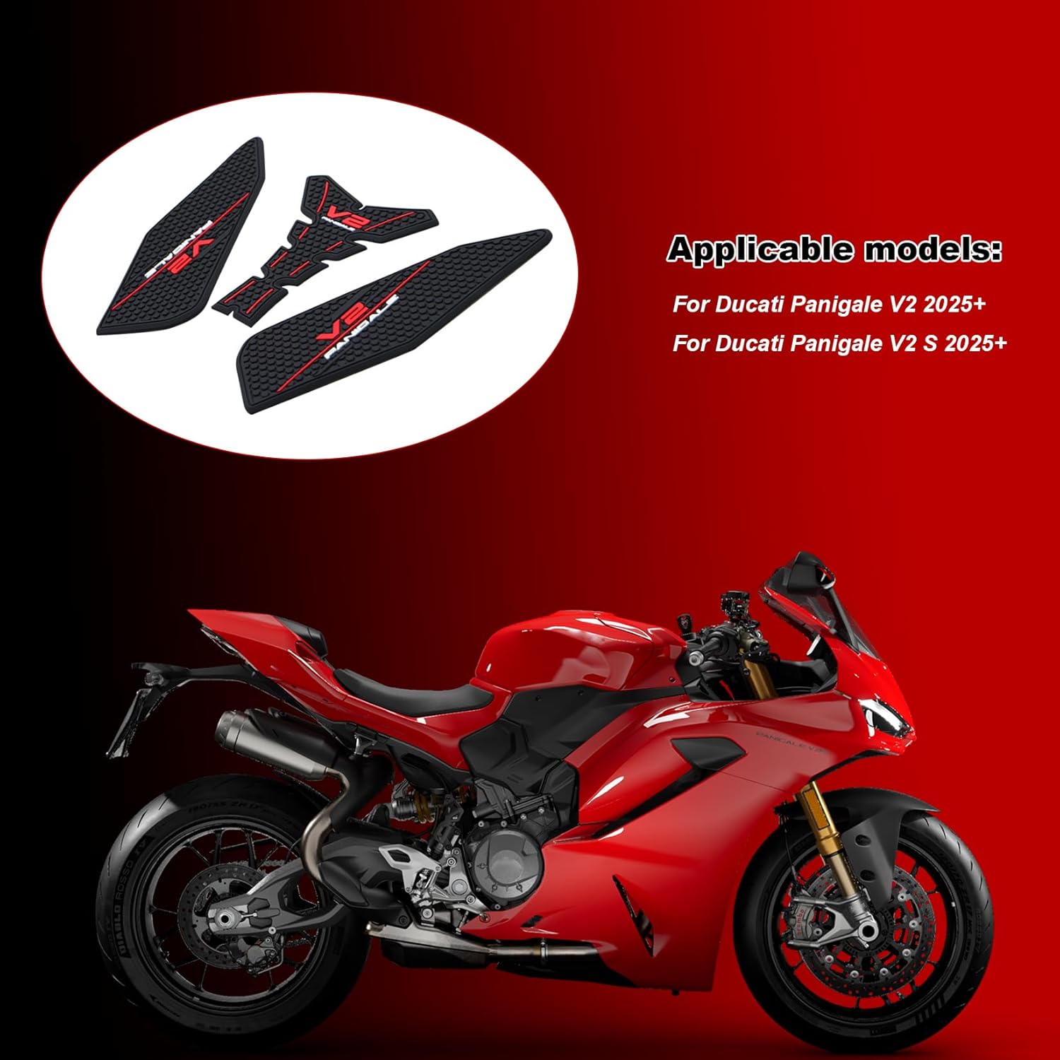Motorcycle Fuel Tank Sticker Pads Quantity: 3 pieces Fitment: For Ducati Panigale V2 2025+ For Ducati Panigale V2 S 2025+ Material:85%-90%Natural Rubber with Adhesive Color: Black Application Techniques: 1.The bonding surfaces must be clean dry and well unified. 2.Ideal tape application temperature range is 21°C to 38°C . Note: The adhesive on the side tank pads must harden for 24 hours For a Better Purchasing Experience, We Provide Pre-Purchase Consultation and After-sales Service. If You Have any Questions, Please Feel Free to Contact Us on the Order Page, and My Honor to Help You.