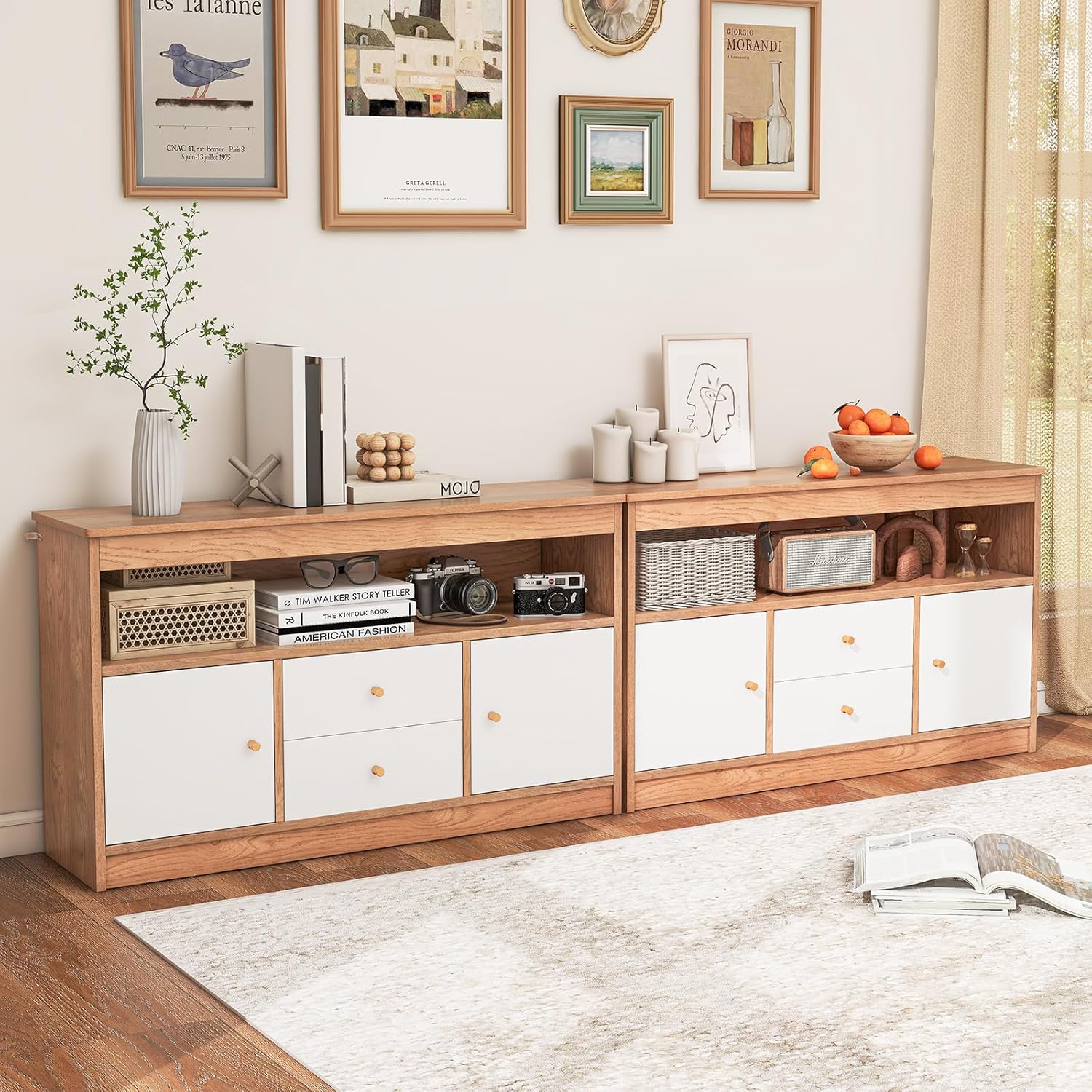 Description: Create a clutter-free and organized play area with this versatile storage display cabinet. Featuring a spacious tabletop, 1 open compartment, 2 closed cabinets, and 2 large drawers, this kids toy storage organizer is perfect for storing toys, books, snacks, and more. The enhanced safety features include 2 anti-toppling devices for added security. This wooden bookcase is not limited to children's spaces and can be used in various rooms. It makes a perfect gift for kids, with its sleek design and storage options to develop organizing skills. Features: Large capacity with 1 open compartment, 2 cabinets and 2 drawers Comes with anti-toppling devices to attach to the wall for extra stability Child-friendly height for easy access to items It complies with ASTM and CPSIA for safe use Crafted with round edges for safety Prevent floor damage with non-slip foot pads Equipped with soft-close hinges and metal drawer slides Screw hole stickers to maintain a neat and sleek appearance Plastic angle code bracket fasteners for reinforcement Includes detailed instructions for assembly Suitable for playroom, kids bedroom, study, kindergarten and any living space Specifications: Color: Natural/White Material: Engineered Wood, MDF Product Dimension: 42" x 12" x 24.5" (L x W x H) Open Compartment Size: 40" x 10.5" x 6.5" (L x W x H) Cabinet Size: 12" x 10.5" x 11.5" (L x W x H) Drawer Size: 12" x 9" x 3.5" (L x W x H) Net Weight: 54.5 lbs Weight Capacity of Top: 154 lbs Weight Capacity of Open Shelf: 110 lbs Weight Capacity of Each Cabinet: 44 lbs Weight Capacity of Each Drawer: 22 lbs Package Includes: 1 x Toy Storage Organizer 1 x Instruction Why You Choose Our Storage Organizer? √ Built with enclosed and open storage space √ Enhanced security with anti-toppling devices
