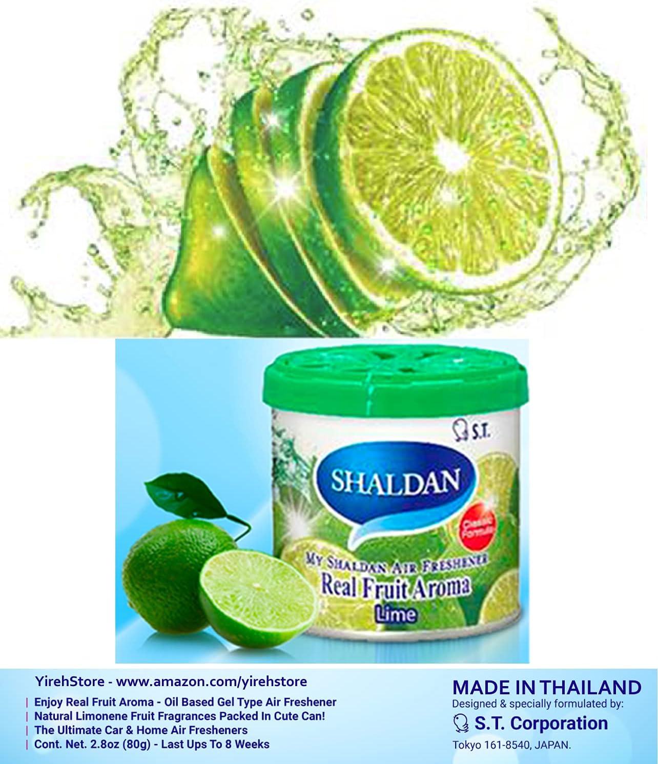 My Shaldan air freshener is made from natural extract oil Limonene. This high quality Limonene oil is made of citrus peel such as orange, lime, grapefruits, etc., that produces fresh, smooth and clean scent as from the Real Fruit Aroma. Net contents 80g/can with 6 variety of popular scent available: Apple, Lemon, Lime, Orange, Peach, and Squash scent.This product has now Made in Thailand since 2015, that is still under ST Corporation Tokyo, Japan division.