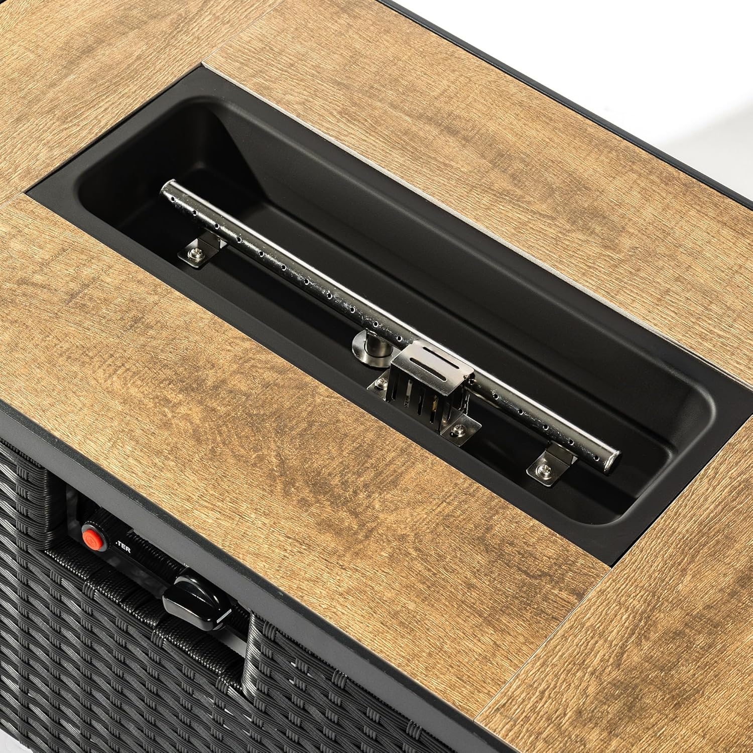 Stylish & Functional DesignEnhance your outdoor gatherings with this rattan fire pit table. Made from durable PE rattan and featuring an elegant ceramic tile tabletop, it combines aesthetic appeal with practicality, seamlessly integrating into gardens, patios, and terraces.Optimized Space UtilizationThe rectangular design of this fire table maximizes space and seating capacity. Unlike traditional round fire tables, it accommodates more guests around it, letting everyone enjoy the warmth and ambiance of the flames.Adjustable Flame ControlExperience the convenience of easily regulating the flame size. The integrated control system allows you to adjust the fire's intensity to suit any occasion, ensuring a cozy outdoor atmosphere.Robust Safety FeaturesThis propane fire table adheres to strict safety standards, designed with multiple safety measures for your peace of mind. Enjoy your evenings by the fire without worry.Sturdy & Durable MaterialsConstructed with high-quality PE rattan and a robust iron frame, this fire table is designed to withstand outdoor conditions, ensuring long-lasting enjoyment for countless gatherings to come.