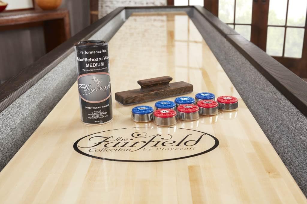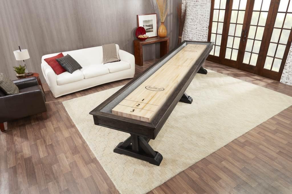 The Brazos River shuffleboards are part of the Fairfield Collection of game tables by Playcraft. The Brazos' trestle leg design and hand finishing is inspired by old world styling and craftsmanship. 12' has two legs. 14' and 16' have three legs. Whether your choice is a timeless Chestnut or Espresso finish, or a distressed weathered Black, or weathered Brown that appears to have been reclaimed from a century old countryside barn, the Brazos is certain to make a statement. More than just beautiful furniture, the high quality materials and construction will ensure many years of high quality shuffleboard with family and friends. The cradle walls and gulley are lined with a complimentary color carpeting to dampen sound. 12' tables feature a one piece cradle design and the 14' & 16' tables feature a two piece cradle design. Included with the Brazos is everything needed to play; set of 2 3/8\" premium weights, Playcraft medium speed wax and matching hardwood board sweep use to help reclaim the speed wax. Assembled dimensions and weights; 12' 145\" L x 33\" W x 32\" H / 575 lbs 14' 169\" L x 33\" W x 32\" H / 675 lbs. Assembly Required. Weathered finishes are achieved by applying semi-transparent stains over a base color of brown on natural wood to create an overtone color range. Finished wood that has naturally weathered outdoors will have varying degrees of intensity within the color range, however, no two boards will be the same. Grain density and lighting will also be a factor on how color is viewed depending upon the grain direction. This effect is by design and the images presented depict the overtone range for each weather color offered. The unique characteristics in grain patterns and color of natural wood, combined with the hand staining process, achieves the old weathered wood design concept of Playcraft weathered game tables. Color variations within an item and between items will exist and should be anticipated.