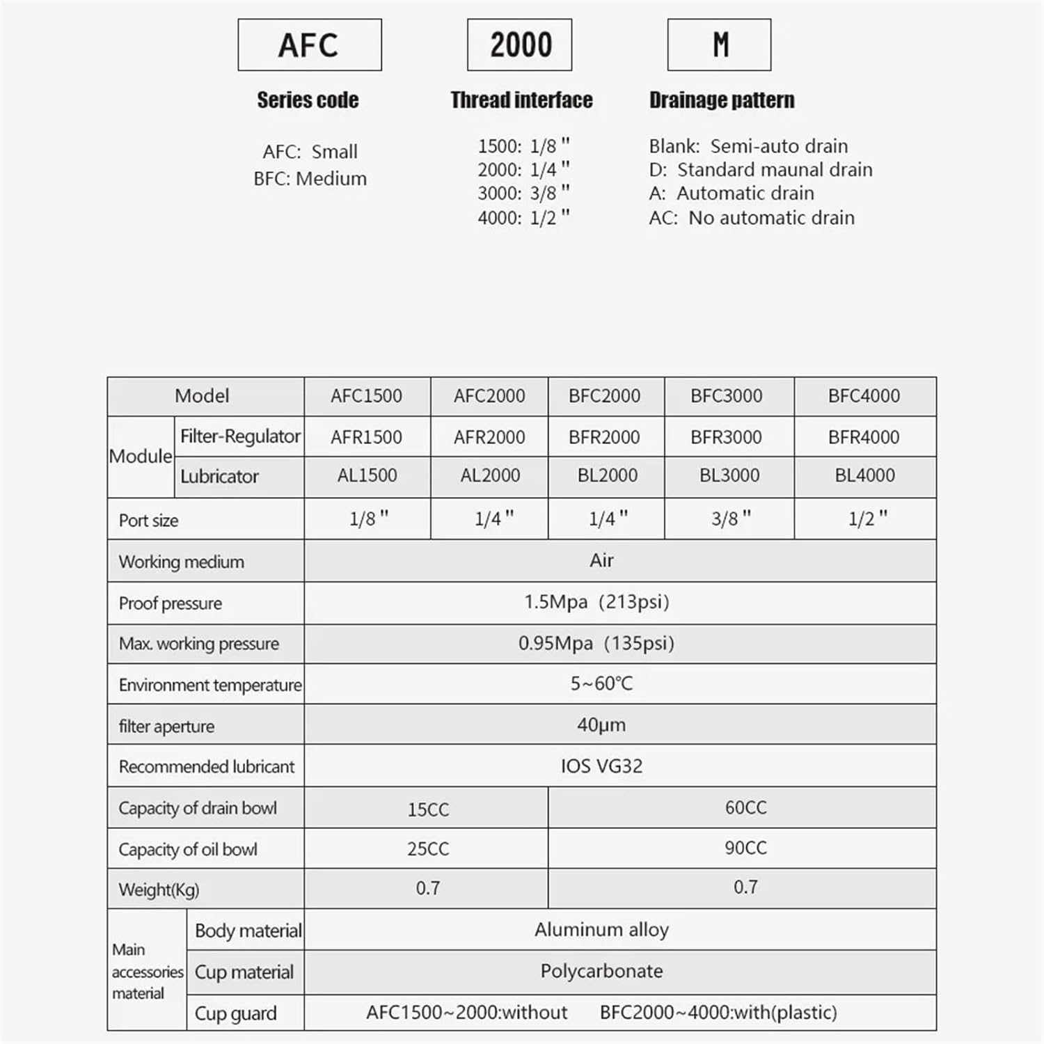 Oil FiltersSpecifications:Proof pressure: 1.5MPaMax. Working pressure: 0.95MPaWorking temperature: 560Filter aperture: 40mCup material: PolycarbonateCup guard: AFC2000(Without)Package Content: Filter ×1