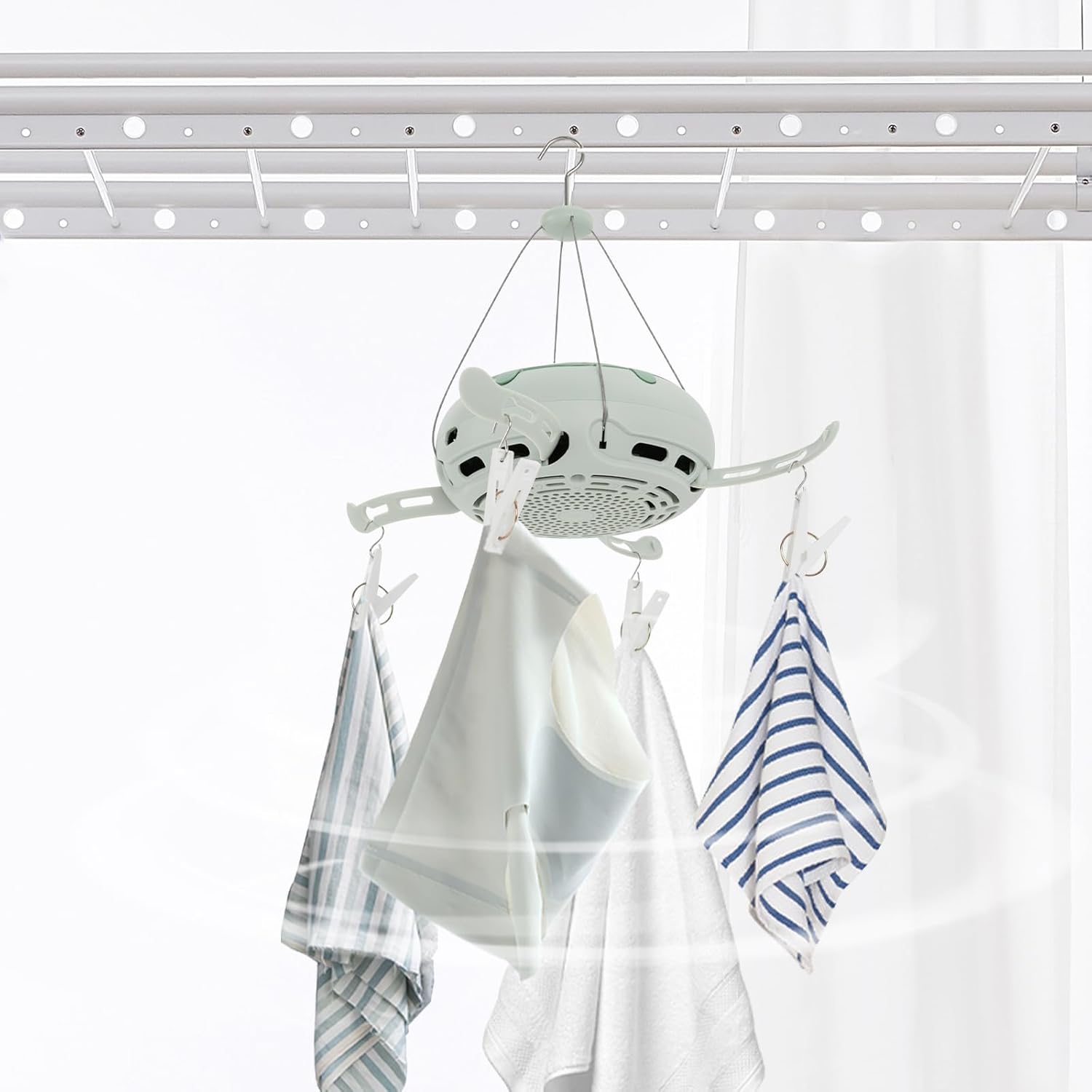 Details Practical Air Intake: The air inlet at the bottom is aesthetically pleasing and durable, yet efficiently utilizes the external wind in the dryer. Practical Hook: It allows you to easily pick up the dryer for hanging use and operation. Clothes Hanger Columns & Side Rotaing Brackets: Hanger columns are suitable for hanging heavy clothes such as trousers and coats with a load capacity of ≤11.02 lbs while rotating brackets are suitable for light clothes such as shirts and skirts with a load capacity of ≤2.2 lbs. 10 Clip Hooks: They make it easy for you to hang socks, underwear, etc., and can be used straight away without having to spend time finding another hanger. Top-mounted Fan: The fan is located above the product to avoid safety hazards. Essential Oil Bin: It allows you to add essential oils (not included) to dry together and make your clothes smell good. Application It is suitable for family living rooms, business trips, traveling, caravans, flats, hotels, dormitories, and other places. It can not only dry clothes, small clothes, socks, shoes, underwear, etc. but also function as a heater, fan. How to Install 1. Pull the rotating bracket outwards. 2. Insert the round ends of the steel wire rope into the corresponding holes and pull them up. 3. Hang the clothes on the dryer with the coat hanger and the clip hooks. 4. Put the drying cover on the bracket from the bottom to the top and tighten the rope buckle. Specifications Style: Modern Shape: Round Color: Light Green Material: ABS, PC Process: Injection Molding Mount Type: Hanging Assembly Required: Yes Access Location: Top Load Plug Type: US Standard Power Source: Corded Voltage: 110V, 60HZ Power: 750W Decibels: 35dB Working Gears: 3 Time Setting Gears: 9 Speed Control Gears: 9 Each Side Rotating Bracket Load Capacity: 1kg/ 2.2 lbs Each Hanger Column Load Capacity: 5kg/ 11.02 lbs Max. Load Capacity: 20kg/ 44.09 lbs Power Cord Length: 1.8m/5.9ft Gross Weight: 0.83kg/ 1.83 lbs Net Weight: 0.7kg/ 1.54 lbs Product Size (D*H): 18.5*8.5cm/ 7.28*3.35 in Package Size: 20*20*15cm/ 7.87*7.87*5.91 in Package Included 1* Collapsible Clothes Dryer 1* Drying Cover 1* Power Cord 1* English Manual 10* Clip Hooks 1* Storage Bag Notes 1.Please use the product according to the operating manual, pay attention to the safety of electricity, and keep it out of reach of children daily. 2.Please do not let the air outlet close to the desktop when using it. 3.Please do not use the dryer against the wall. 4.Please do not lift the bracket directly to avoid bracket breaking. 5.Please do not hang thick clothing for a long time. Please allow the slight color difference caused by the shooting light and 1-3cm error due to manual measurement, and make sure you do not mind before you order.
