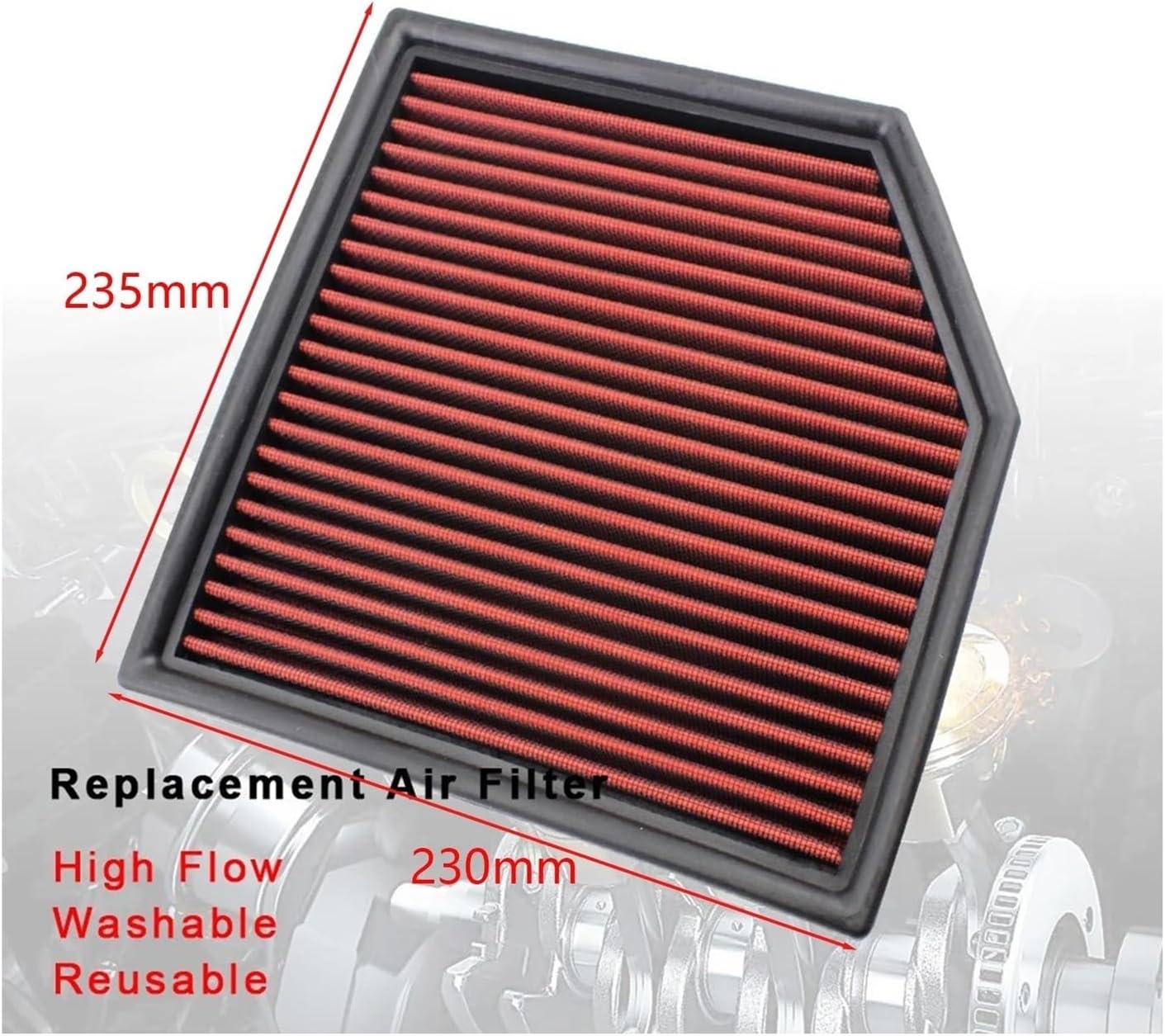 Air Cleaner MountingSpecifications:Product Name: Replacement Panel Sport Air FilterMaterial:Non-woven fabricMain Color: Red-BlackWeight: 450gSize: 235*230mmHign-concerned Chemical : NoneOrigin : Mainland China