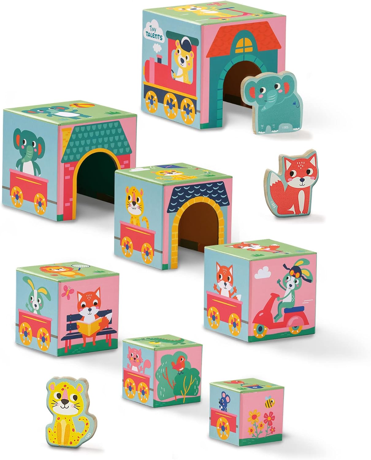 Get stacking! With this stacking blocks tower from SES Creative, children can entertain themselves for hours. Seven open stacking blocks with super fun illustrations are home to the three wooden animal figures that come with this set! Stack the blocks in different ways and let the animals walk through the holes in the tower. Each side of the tower forms a new stack or row with a different theme. Make a train, tree, street, tower and more! The blocks fall easily into eachother, which makes them super easy to store and save space.