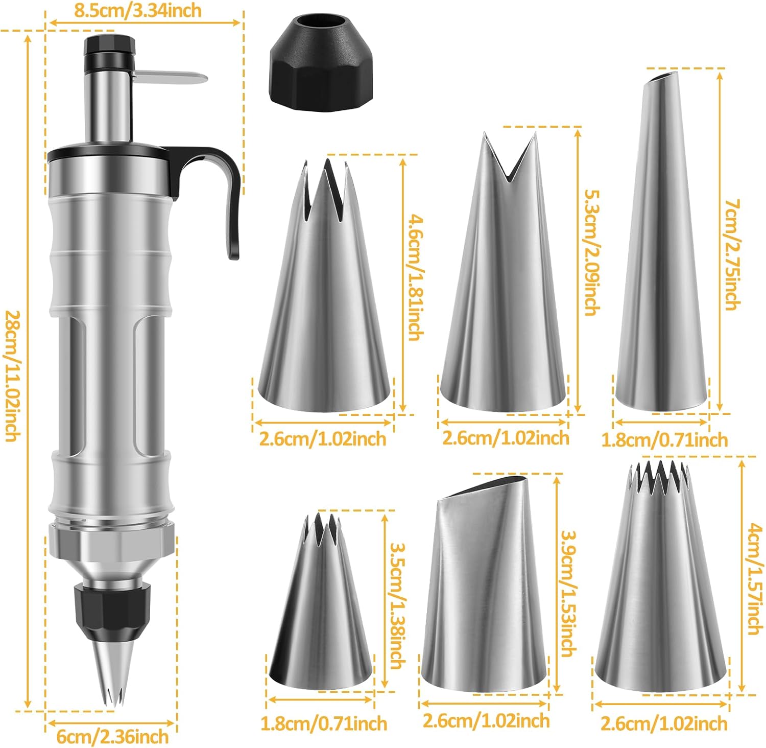 List of items: 1 × Cake Decorating Syringe Set 6 × Garnish Tips Description: This cookie press set includes a cake decorating syringe and 6 piping tips for your homemade cookies or desserts. It is also easy to clean and suitable for long-term use. Main Features Convenient Cupcake Decorating Kit:This cupcake decorating kit comes with a cake decorating syringe and 6 piping tips to make different shapes of cookies and desserts at home by yourself, ideal for baking enthusiasts. EFFORTLESS CLEANING This dessert decorating sets has a removable design, which is effortless to clean after use and is suitable for long-term use. Specifications: Product name: cake decorating syringe set Color: black Material: stainless steel, aluminum and silicone Size: Cake decorating syringe: 60 x 280 x 85 mm 6 nozzles: 35 x 18 mm, 40 x 26 mm, 39 x 26 mm, 46 x 26 mm, 53 x 26 mm, 70 x 18 mm Note: 1. There may be slight differences between the picture and the actual colour of the product. We do our best to show you the exact colour. 2. Please allow slight deviation in dimensions due to manual measurement.