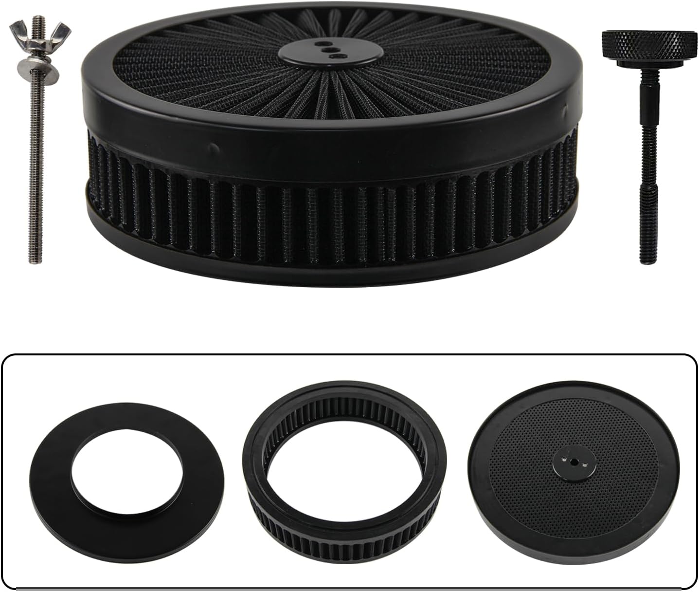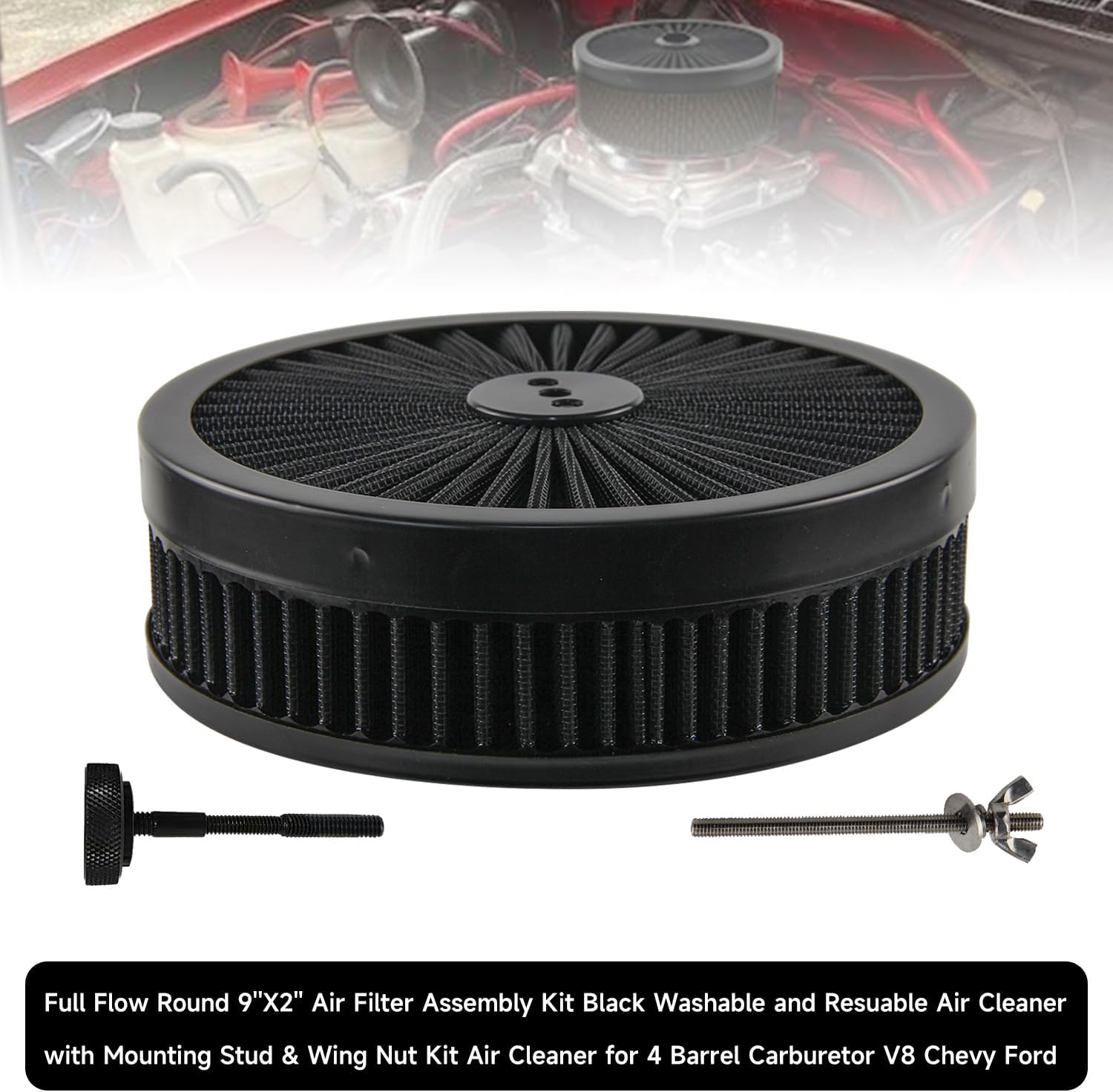 Application: Universal to any carburetor with a 5.125"neck diameter. Fitment: 4 barrel carburetors, commonly found on Chevy, Chrysler, Ford V8 engines Description: Top Type: Steel Trim & Cotton Gauze Washable. Base Type: Flat Stamped Steel. Element Type: 9" x 2" Tall - Cotton Gauze Washable Element Cleanable and reusable, can deliver outstanding engine protection and come in wide range of applications. Include: 1 x 9" Anodized Top 1x Anodized Base 1 x 9" High-Flow Black Washable & Reusable Filter 1 x Muting stud 1 x Wing nut. Note: Doesn't come with installation instructions We recommend professional installation Only
