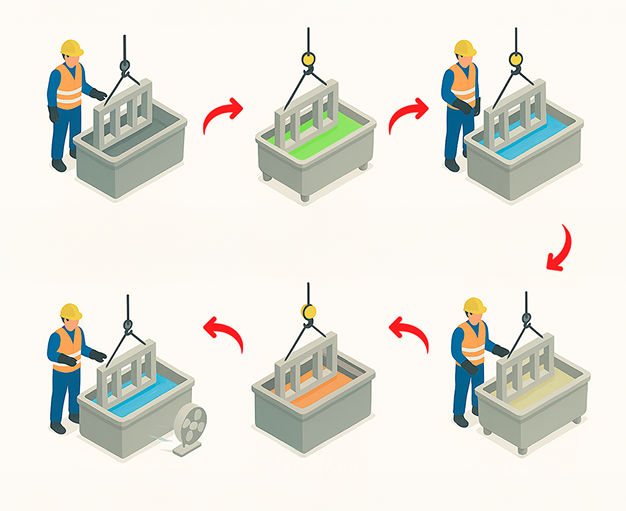 Se utiliza ácido para eliminar óxidos y residuos del metal, dejando la superficie limpia.